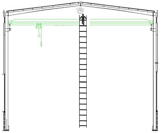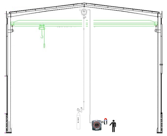 針對輕于空氣的可燃有毒氣體的檢測,一般會在廠房最高處易于聚集氣體的位置安裝氣體檢測器。氣體檢測器需要定期做校準(zhǔn)和維護(hù),此時就涉及到如何維護(hù)的問題,傳統(tǒng)的做法是維護(hù)人員攜帶工具及標(biāo)準(zhǔn)氣瓶爬梯子上到高處予以維護(hù),危險性大,可操作性差。具體做法如下圖所示。