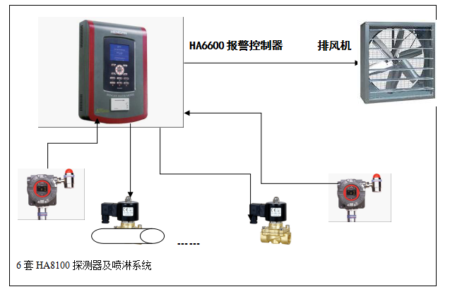 在有效覆蓋面積內(nèi),可設(shè)一臺(tái)檢測(cè)器。有毒氣體檢測(cè)器與釋放源的距離,室外不宜大于2m,室內(nèi)不宜大于1m。設(shè)置可燃?xì)怏w或有毒氣體檢測(cè)報(bào)警儀的場(chǎng)所,宜采用固定式??扇?xì)怏w和有毒氣體檢測(cè)報(bào)警系統(tǒng)宜為相對(duì)獨(dú)立的儀表系統(tǒng)。根據(jù)貴司的實(shí)際情況,建議在制冷間安裝6臺(tái)氨氣檢測(cè)器HA8100,應(yīng)采用電化學(xué)檢測(cè)原理;1臺(tái)氣體檢測(cè)控制器配置6臺(tái)模塊化智能檢測(cè)探測(cè)器并各自連接1個(gè)噴淋頭,當(dāng)某個(gè)探測(cè)器檢測(cè)到的氨氣濃度值達(dá)到報(bào)警值時(shí),繼電器驅(qū)動(dòng)相應(yīng)噴淋頭對(duì)所在區(qū)域進(jìn)行噴淋,稀釋氨氣的濃度,其他區(qū)域的噴淋則不會(huì)啟動(dòng)。另外,報(bào)警裝置與風(fēng)機(jī)進(jìn)行聯(lián)動(dòng)工作,當(dāng)報(bào)警裝置啟動(dòng)時(shí),風(fēng)機(jī)也同時(shí)啟動(dòng)。