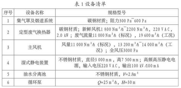 系統(tǒng)包括:定型廢氣換熱系統(tǒng)、濕式靜電裝置系統(tǒng)、主風(fēng)機(jī)等,主要設(shè)備參數(shù)見表1。