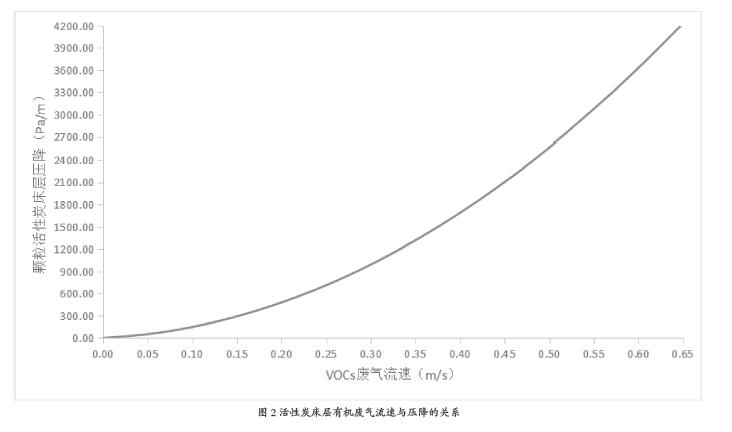 式(1)中:△P為單位活性炭床層高度壓降,單位為帕斯卡每米(Pa/m);υ為有機(jī)廢氣流速,單位為米每秒(m/s)。
