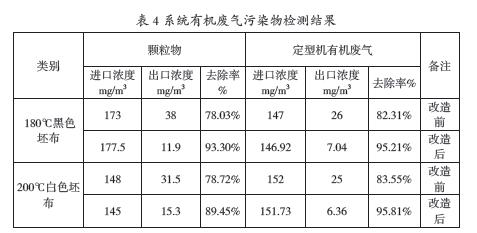 該文所提出的紡織印染定型機(jī)有機(jī)廢氣凈化處理技術(shù)工藝,即在原定型有機(jī)廢氣濕式靜電處理系統(tǒng)的基礎(chǔ)上進(jìn)行技術(shù)改造,新增加了活性炭吸附、再生處理和催化氧化裝置系統(tǒng),VOCs總的脫除效率達(dá)到95%以上。通過現(xiàn)場實際檢測顆粒物除效率為93.3%和89.45%,VOCs總的脫除效率為95.21%和95.81%。