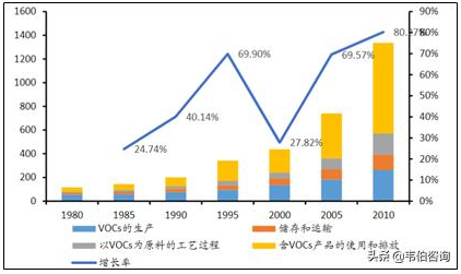 圖表 1:1980年以來(lái)中國(guó)工業(yè)源VOCs排放總量變化趨勢(shì)(萬(wàn)噸)