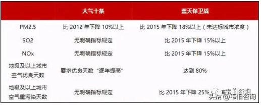 圖表 5:“藍(lán)天保衛(wèi)戰(zhàn)”與“大氣十條”主要指標(biāo)對(duì)比