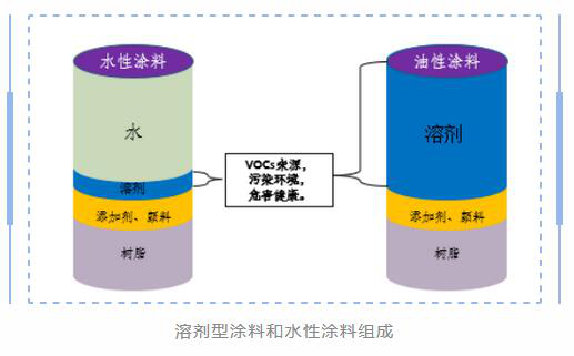 水性涂料用水作為分散介質(zhì),即用水來(lái)調(diào)漆,在噴涂和干燥過(guò)程中揮發(fā)的是水,VOCs排放極少。溶劑型涂料用有機(jī)溶劑(VOCs含量100%的稀釋劑)來(lái)調(diào)漆,在噴涂和干燥過(guò)程中有大量的VOCs揮發(fā)。