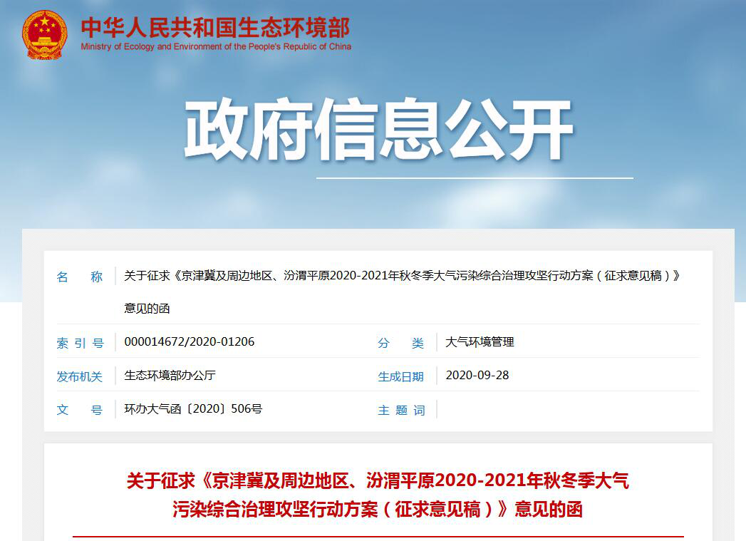 日前,生態(tài)環(huán)境部發(fā)布《京津冀及周邊地區(qū)、汾渭平原2020-2021年秋冬季大氣污染綜合治理攻堅(jiān)行動(dòng)方案(征求意見稿)》。
