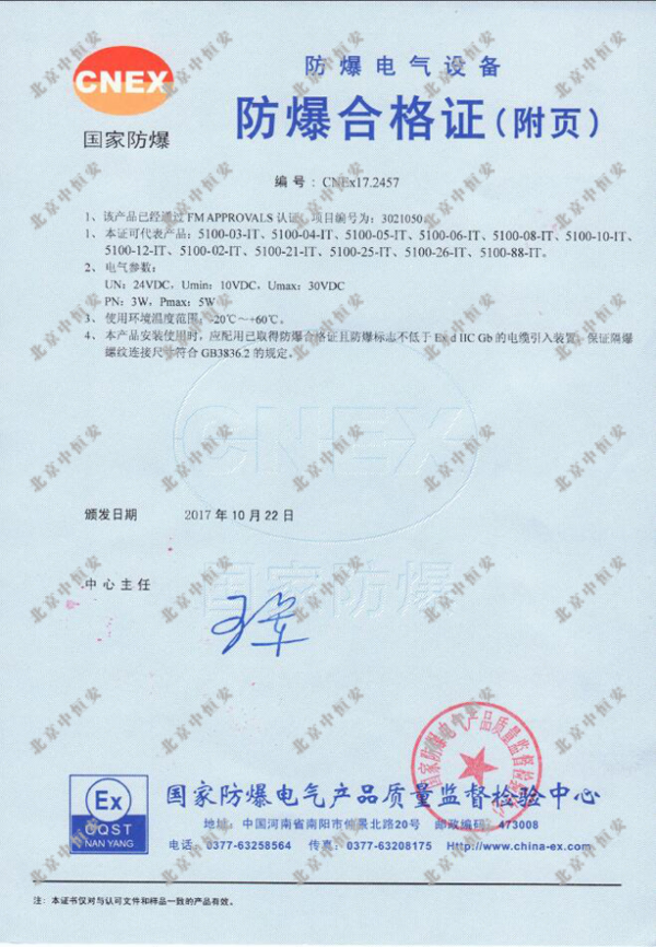 ATEX (5100-XX-IT): II 2 G Ex d IIB+H2 T6 Gb Ta = -20oC to +50oC